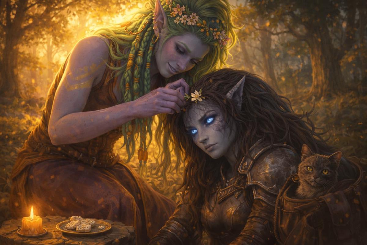 Giselle stepped through the trees and found a troll woman kneeling in moss with a fox’s burned paw in her lap, two birds on her shoulder, and Cinder the market cat asleep in an open satchel like a creature who had won something.